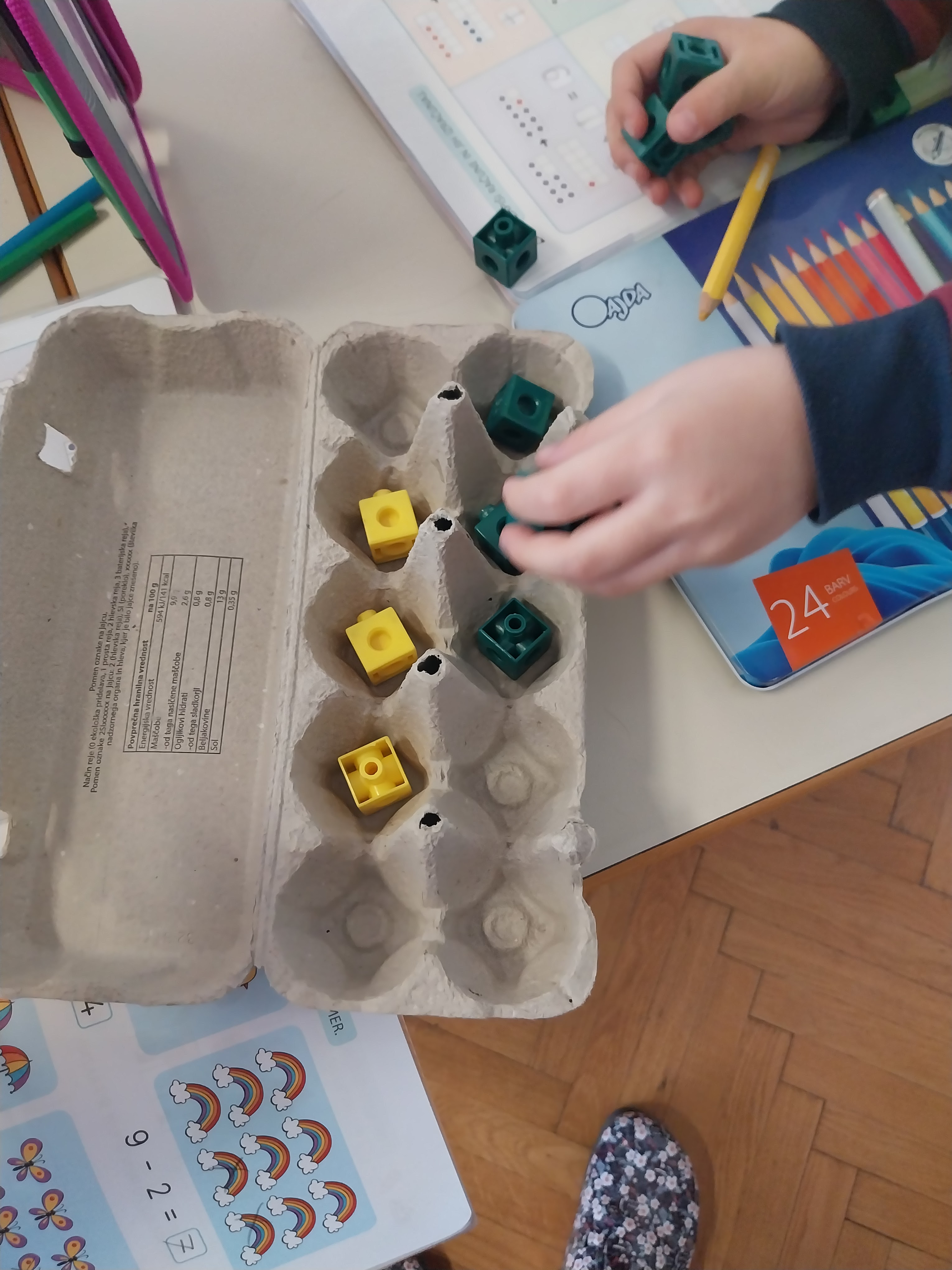Prvošolci pri pouku matematike z veseljem uporabljamo odpadle jajčne škatle, ki nam pomagajo pri računanju do 10.